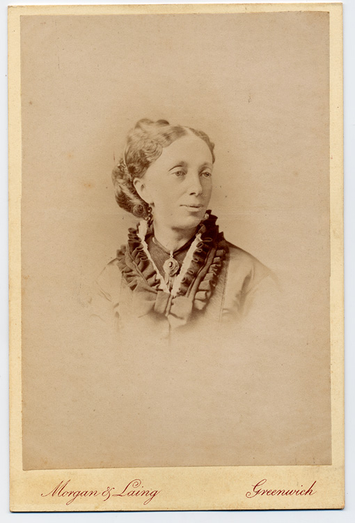 Description: A cabinet card of 'Cousin Charlotte Branwell', noted as a distant cousin of JR Branwell's branch of the Branwell family, who lived at Penlee House. Below is printedto the left 'Morgan and Laing' and to the right 'Greenwich'. On the reverse is printed the emblem of the photographer - 'Morgan and Laing Late with H. Hering Photographers Miniature Painters to the Queen Helio House Studio Circus Greenwich'.