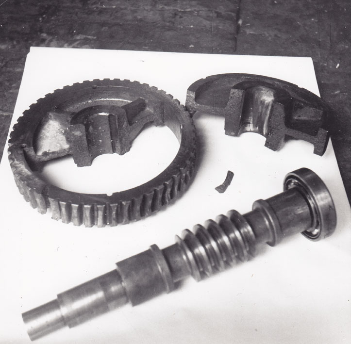 Description: It is part of a set of photographs taken, probably by the Richards Brothers, in order to make an insurance claim following the storm damage. This one shows parts of a broken cog wheel and bearing.