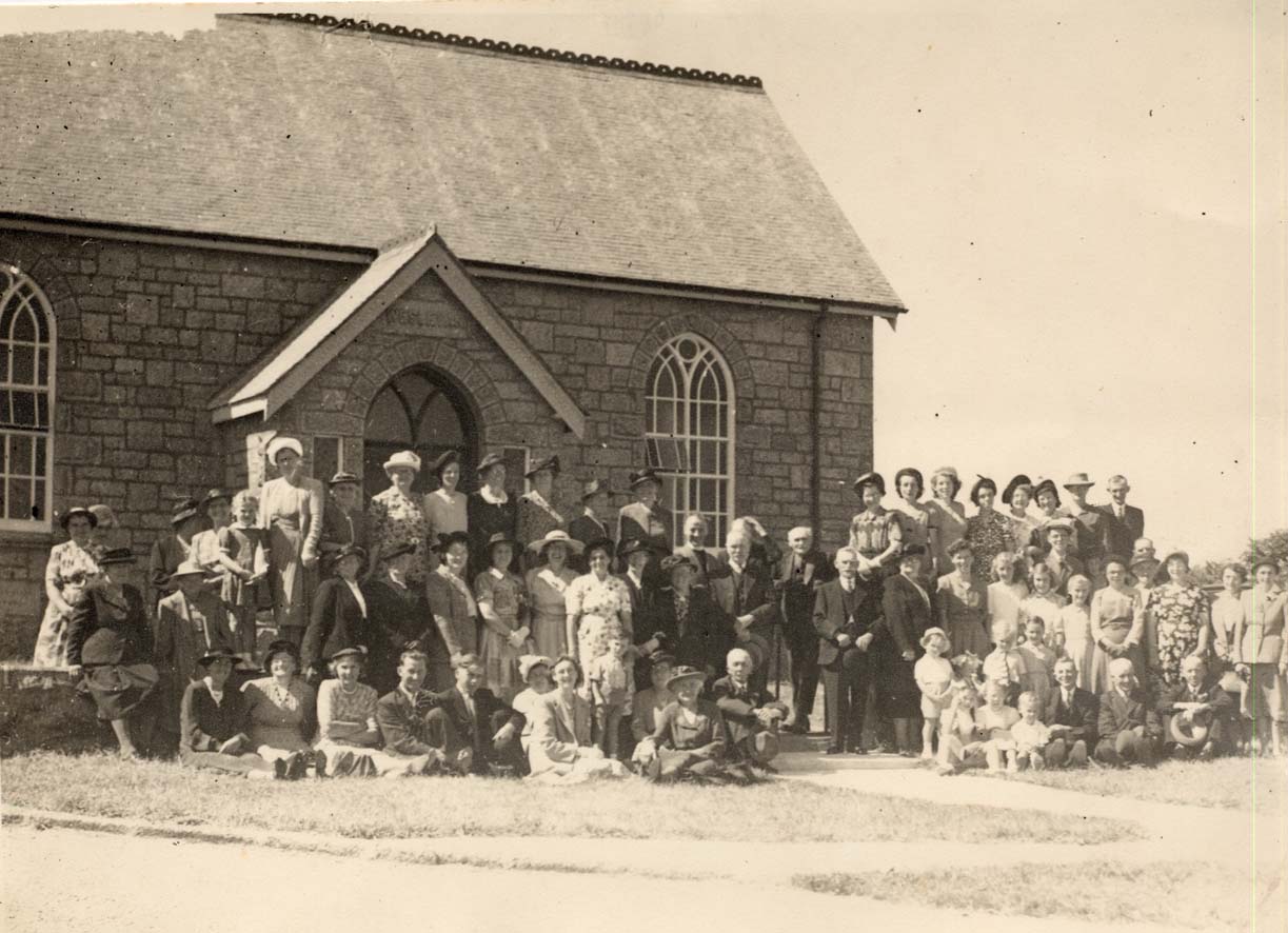 Description: A celebratory gathering at the re-opening of Crows an Wra Methodist Church following redecoration in 1951. The foundation stone was laid on 2 May 1902. Best Cornish granite was offered as a gift for the building by Mr N T Williams.
