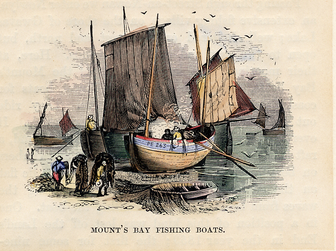 Description: Engraving of Mount's Bay fishing boats from J.T.Blight's 'A week at the Land's End', published in May 1861.