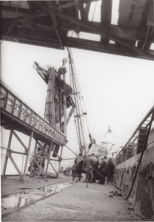 Description: It is part of a set of photographs taken in order to make an insurance claim following the storm damage. View of aggregate loading gear at Newlyn harbour following storm damage. This appears to show several men inspecting damage.