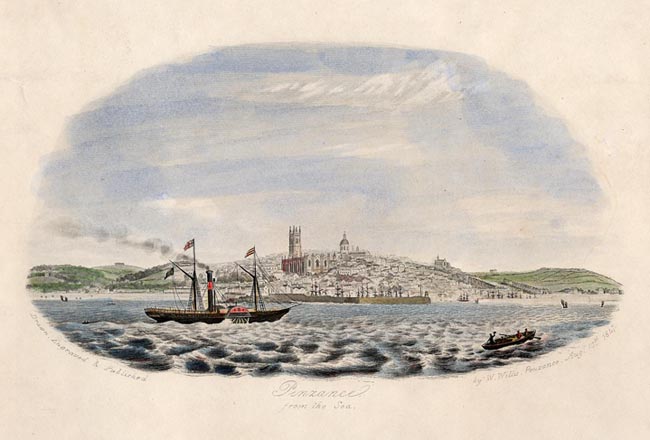 Description: View of Penzance taken from the sea, in the centre of the image is the harbour, St. Mary's Church and the Market House. In the foreground is a large steam ship and a small rowing boat.