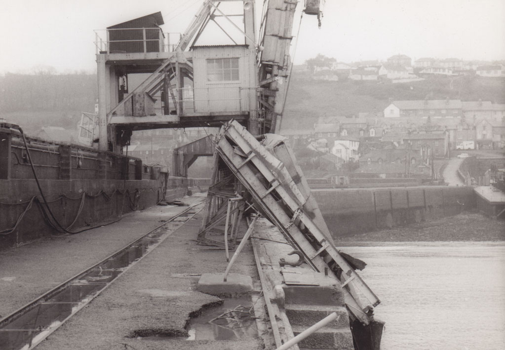 Description: It is part of a set of photographs taken in order to make an insurance claim following the storm damage. Beneath the operator's cabin, one can see the stone tram tipping shed; to its right is the traversing loading gantry. The twisted conveyor feed section is leaning over the side of the quay.