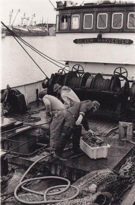 Description: Skipper Michael Hosking is filling a basket of crabs on deck the Silver Harvester PZ622 by the Mary Williams Pier in Newlyn. She was the largest vessel to fish from Newlyn, having a long and successful career beam trawling and trawling for mackerel. She paired with Dew Genen PZ185, mackerel fishing off West Scotland in 1974 and landing at Ullapool in 1980. She was a Dutch beam trawler Jan Marsten ex Rose Marie registered as PZ622 Silver Harvester in 1982 and owned by Michael Hosking and Partners of Porthleven. She was decommissioned in 2002.