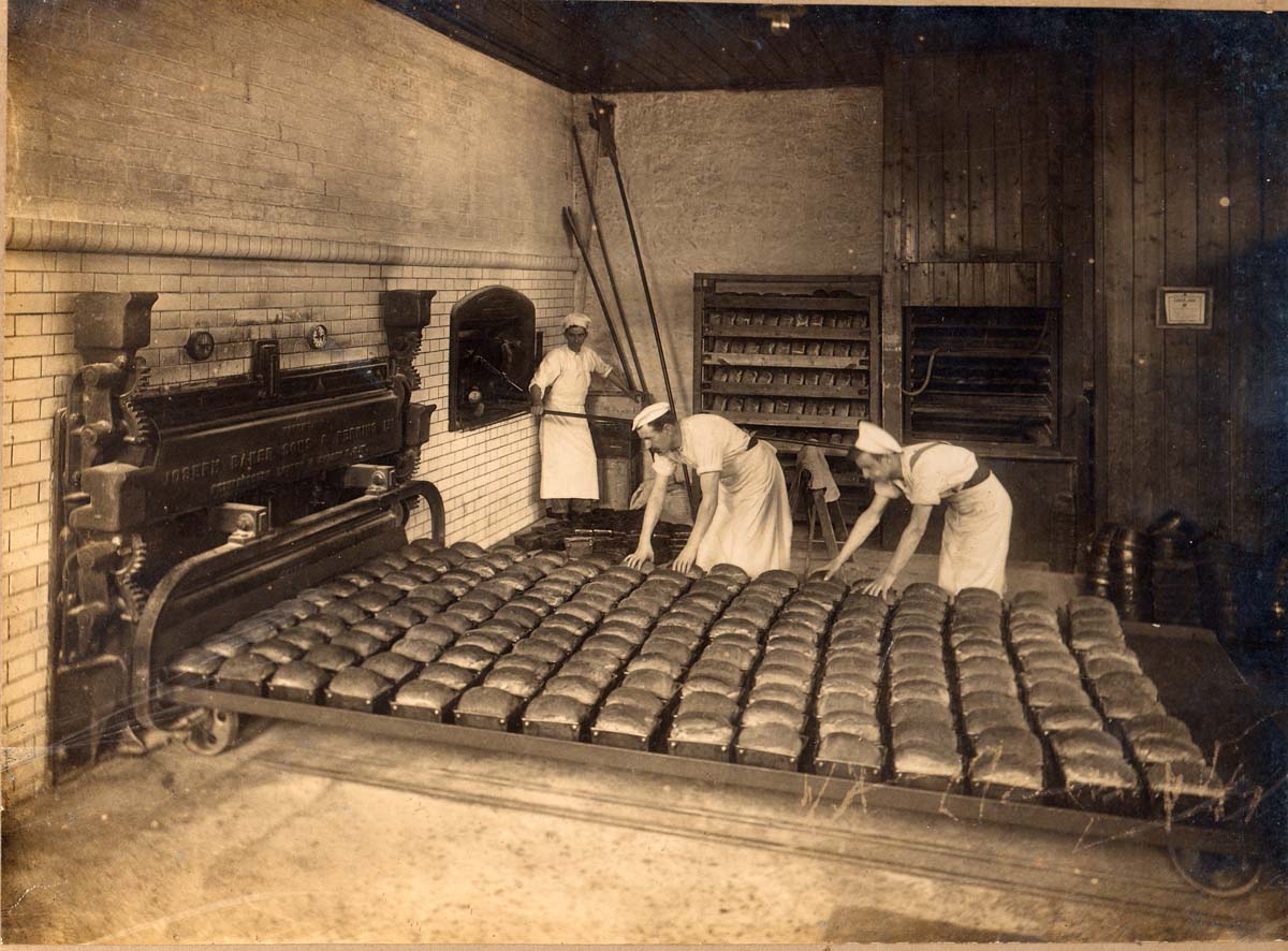 Description: On the ground floor of the bakery set into a tiled wall is a Joseph Baker Sons and Perkins Ltd oven, the shelves of which pulled out along the two sets of tracks on the floor. Two temperature gauges are set into the wall above. To the right, is an oven without a door (in the style of the traditional cloam oven) with a thermometer set into the wall at its side. In this picture two bakers are bending over the tray of 180 loaves which have just come out of the oven and are apparently pressing them to see if they are cooked. A third operative stands in the corner beside what looks like three large poles for retrieving the bread from the oven. It is too dark to see what is on the far wall; it could be loaves left to rise. Dark panelling incorporating a recess completes the picture to the right.