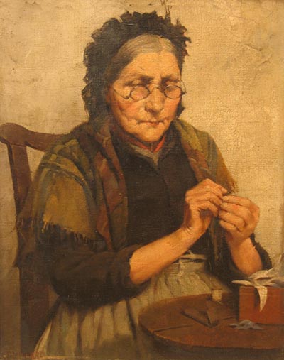 Description: Portrait of an old lady threading a needle.