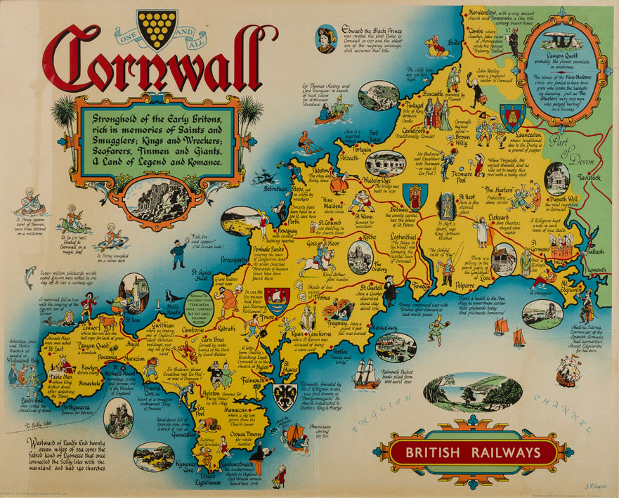 Description: Map of Cornwall showing railway line and towns with illustrations, produced for British Railways.