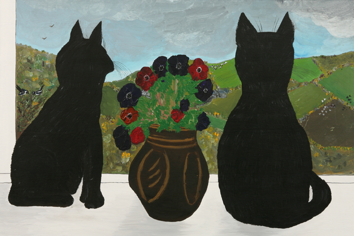 Description: Painting of the artist's cats, Margaret and Elizabeth, looking out of the studio window.