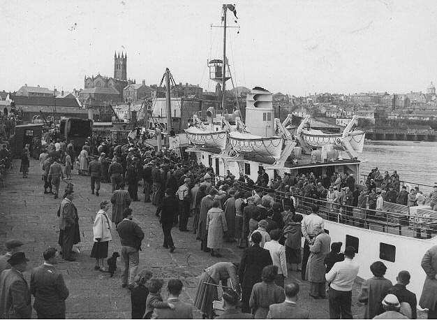 Description: Spectators on the quay at Penzance are watching the Scillonian II being prepared for her maiden voyage to the Isles of Scilly on 17 November 1955. Many of these were Scillonians who made the special trip from Southampton to Penzance.