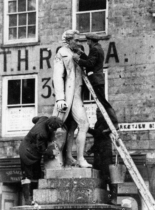 Description: Workmen are cleaning the statue of Sir Humphry Davy. It was erected in 1872, carved by Wills of London in white marble and paid for by public subscription.