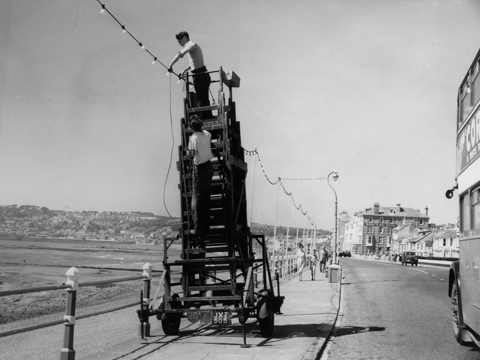 Description: The shape of the concrete lamp post puts this photograph in the 1950s. Electricians, probably employed by SWEB, are erecting a string of lights along the Promenade in readiness for the Summer season. Newlyn can be seen in the distance with the Queen's Hotel on the right.