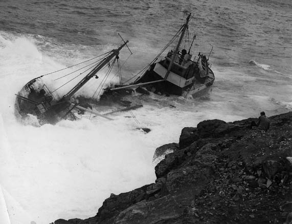 Item: The Traute Sarnow hitting the rocks at Gurnard's Head, a spectator is on the cliff on the bottom right hand side of the picture