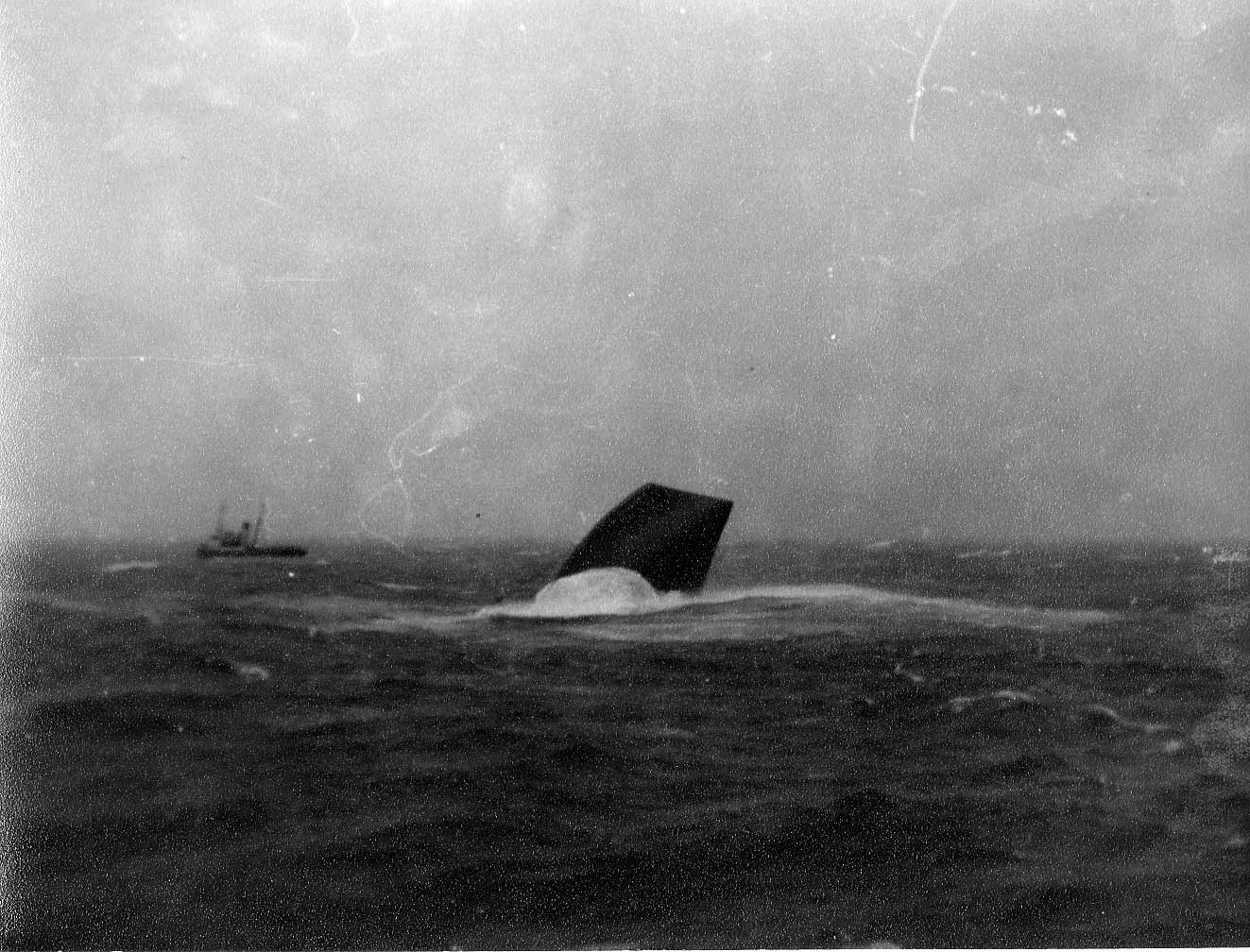 Description: Hull of a wrecked ship protruding from the sea, with another vessel in the background