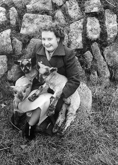 Description: Wendy Tunmore with lamb triplets born on Manor Farm, Pendeen, January 1956. Photograph appeared in The Cornishman 19 January 1956.
