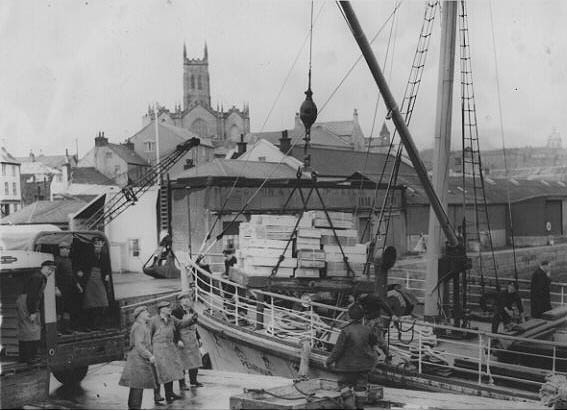 Description: Isles of Scilly flowers are being winched from the Peninnis on to the quay at Penzance. Two railway lorries and staff are standing by to take the cargo to the nearby railway station for onward transmission to market. St Mary’s Church is in the background.