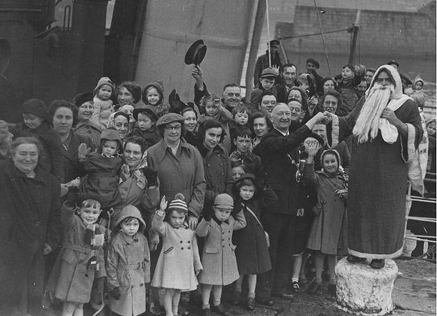 Description: Father Christmas shaking hands with the Mayor, Councillor Frederick George Ford, surrounded by children and parents on the quay at Penzance.