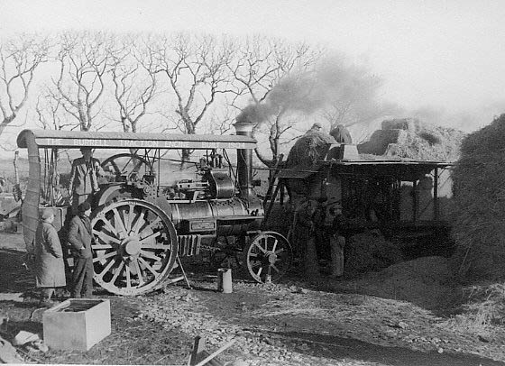 Description: Winter threshing with a steam engine. Note that the men are working in overcoats, and the old binder canvas is hanging at the rear to protect the engine driver from the wind. Note also the iron brackets hanging in front of the rear wheel which were known as 'spuds'. These would be bolted on to the rear wheels to give the engine more traction on wet ground. Note the wooden jack against the rear wheel which kept the engine from rocking to and fro when working.