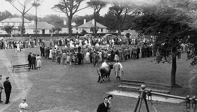Description: Guernsey cows are being judged in the ring, while a bull is being led across the centre of the picture. This looks like land beside the Coronation Lake in Helston, adjacent to the old cattle market.
