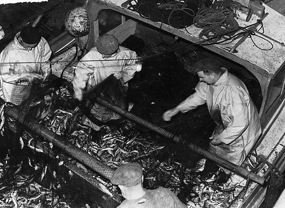 Description: Haul of Pilchards on a fishing boat belonging to Harry Blewett. Possibly the 1500 stone catch pictured in the Cornishman of 3 November 1950, page 6