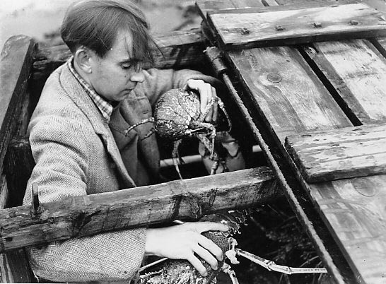 Description: Gerald Harvey taking Crayfish from a storage container at Newlyn