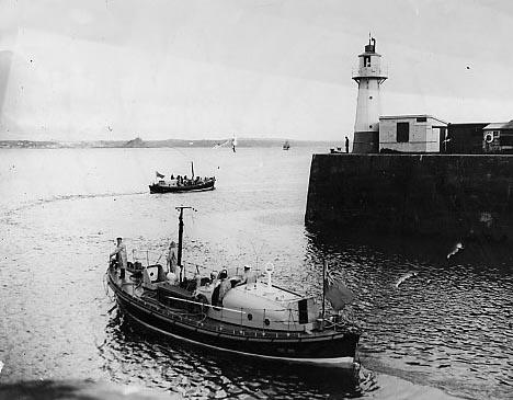 Description: A Watson class lifeboat leaving Newlyn harbour