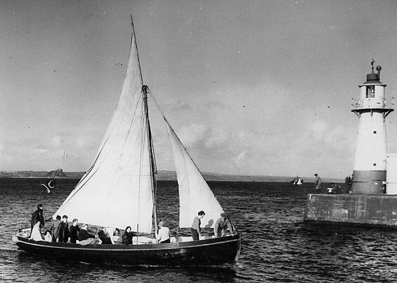 Description: Sailing vessel entering Newlyn harbour, possibly a Naval Cutter
