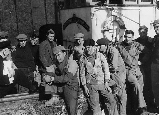 Description: Crew on board trawler PZ331 based in Newlyn, the 'Anthony Stevenson', probably in Newlyn harbour, talking to Superintendent Patterson of the RNMDSF from the Ship Institute who is handing magazines to the skipper. In the forefront are Breton fishermen from Concarneau wearing clogs.