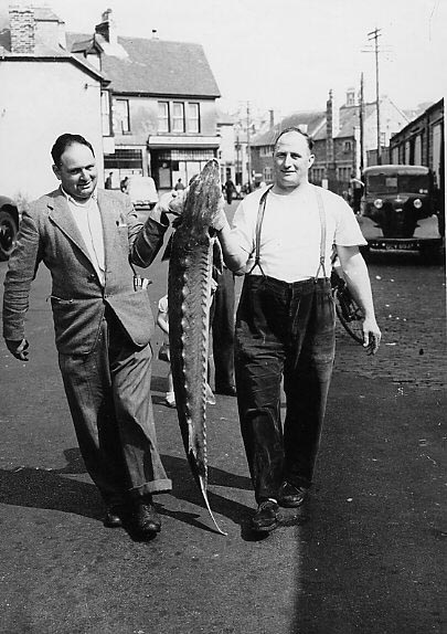 Description: Mr Harry Small (right) with a sturgeon near Newlyn fish market