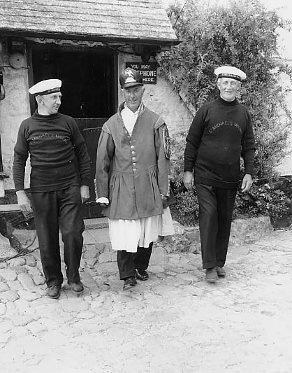 Description: Left to right stand Albert Matthews, Sidney Burt and 'Uncle' Robert Matthews. Sidney Burt is wearing the former part of a boatmen's ceremonial uniform of a generation before. The changing room had public telephones, daily papers from Marazion. Changing House was so called because people changed from working clothes to suitable clothing for evening fishing or leisure on the mainland. This photograph was taken at the time of the BBC television half hour live broadcast in the summer of 1957.