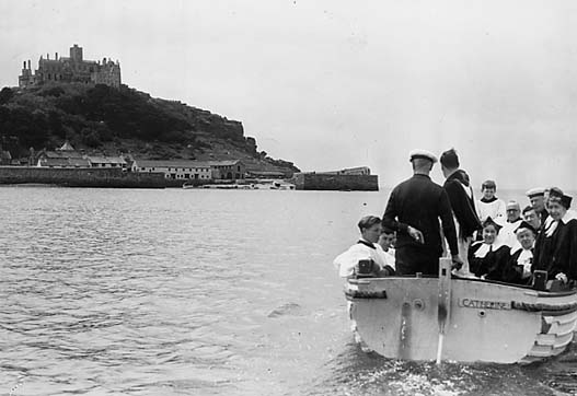 Description: Marazion Parish Church choir members including Tom Reynolds with the Vicar, the Reverend Lionel Farley, are being ferried to a service on St Michael's Mount. Regular Sunday morning services are held in the Church throughout the summer months.