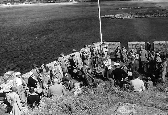 Item: A St Michaels Mount guide addressing tourists on the northern corner of the western battery