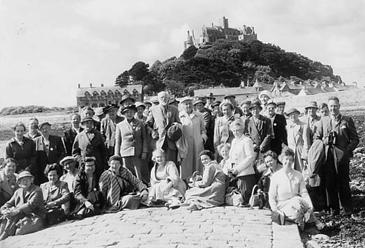 Description: An unidentified group pictured on the causeway to St Michael's Mount
