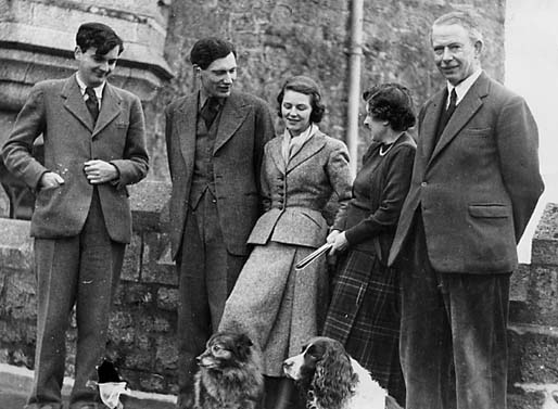 Description: L-R Mr Giles St Aubyn (younger son of Lord and Lady St Levan); Mr John St Aubyn (subsequent Lord St Levan); John St Aubyn's former fiancee; former Lady St Levan now the Dowager Lady St Levan; Lord St Levan (Cecil Francis St Aubyn); dogs Corolla, which bit Harry Penhaul's wife's left knee in 1946, and Ben the spaniel.