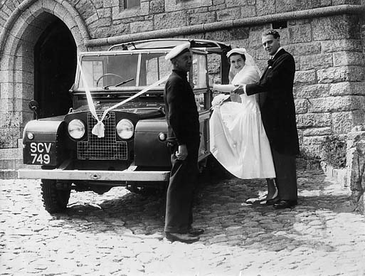 Description: All aboard the Mount land rover. Photo taken outside the private east door to the castle on St Michael's Mount. L-R Mr Albert Matthews (driver); the former Mis Jean Bulcock and Geoffrey Jago. Their wedding reception was held at the Godolphin Hotel in Marazion. It was an all Cornish wedding reception with pasties, hevva cake and saffron cake for 80 guests.