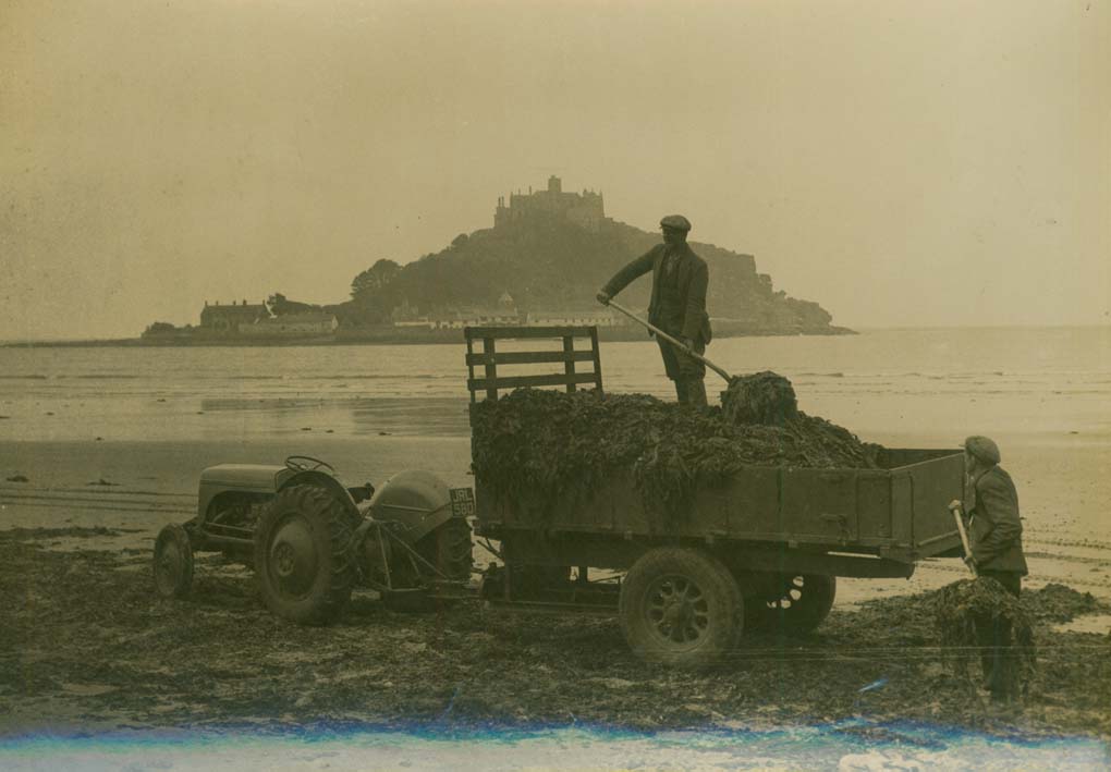 Description: People are gathering seaweed on Marazion beach for use on nearby fields, with St. Michael's Mount in background