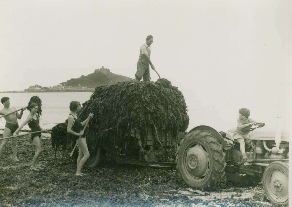 Description: The farmer Geoffrey Lawrey from Tolver Farm, Gulval, is collecting seaweed for use on the land. Containing Nitrogen, Potash, Potassium, amino acids and trace elements, it is an excellent activator for compost. It does not add much bulk to the soil but the alginates help to bind soil crumbs together. His nephew John Lewis is on the tractor. The girls were visitors' children asked to pose by Harry Penhaul.