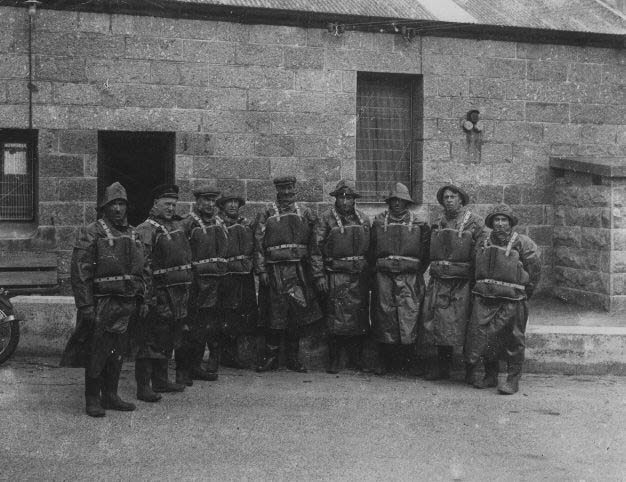 Description: Reg Watkiss seems to think that this picture may have been taken just after the crew returned from rescuing four men from the former War Department hulk, Empire Flamingo on 26 October 1948. This would be before Harry Penhaul had his own business. Left to right: Edward George; Henry Nicholas; Nathaniel George, who was coxswain from 1944 to 1947; Will Trenery; Long John Roberts; James Howard Nicholas; Dick Penrose; Charlie Trenery; Edmund George.