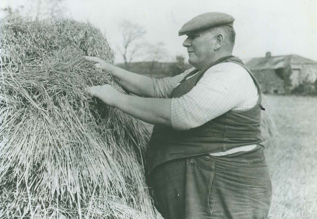 Description: Mr Cyril Richards of Lower Trevaylor Farm, Gulval was known locally as "Gobbins." He is building a hand mow of oats. After the corn was cut with the binder it would be put into shocks of 6 sheaves. After a week or so the sheaves would be built into a hand mow of about ten shocks. It was now considered 'saved' and would be left out to dry in the field until pulled in to a rick or directly to the thrashing machine. Cyril Richards was one of the last farmers to work his farm completely with horses. He died in 1968 aged 61.