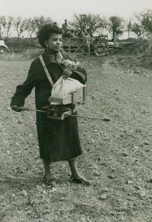 Description: This young lady is pictured with an aero seeder, commonly known as a seed fiddle. It would be used to sow small seeds such as grass, clovers and kale on some small farms where there was no corn drill. Small fields would be sown with wheat, barley or oats as the farmer walked along. The right arm worked the bow in time with the left leg whilst the spinner plate would throw an arc of seed to about 12’ to 14’. This is one of a series of photographs Harry Penhaul took of the formal visit to West Cornwall in April 1957of these students from Iraq.