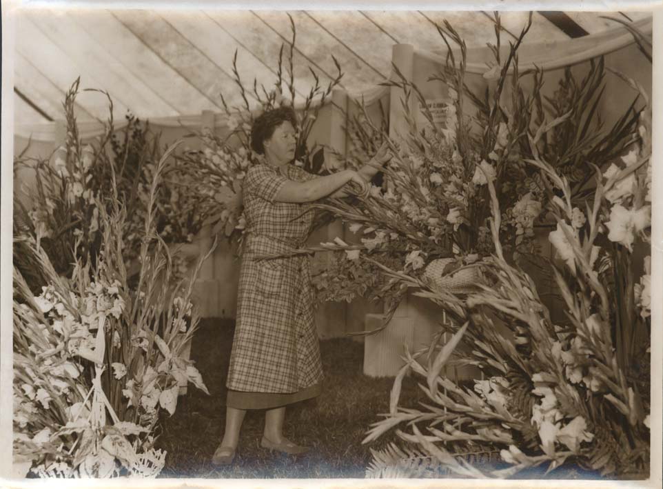Description: A lady is putting the finishing touches to the gladioli display at the Camborne Show which used to be held on a Bank Holiday Monday.