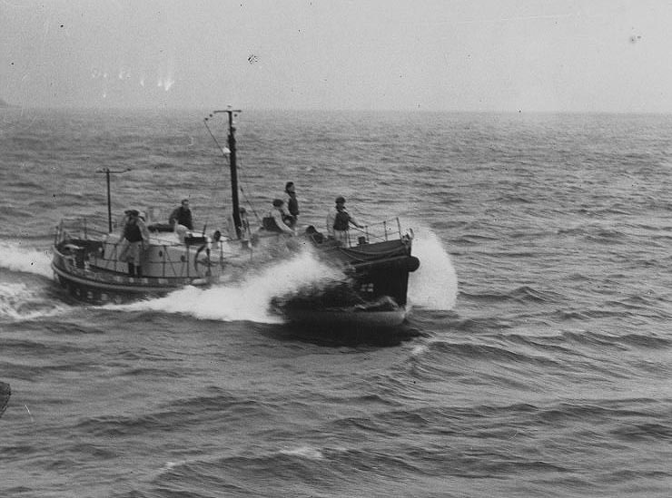 Description: Penlee lifeboat at sea with the crew, in full weatherproof gear and life jackets huddled around the cockpit. The masthead light is illuminated.