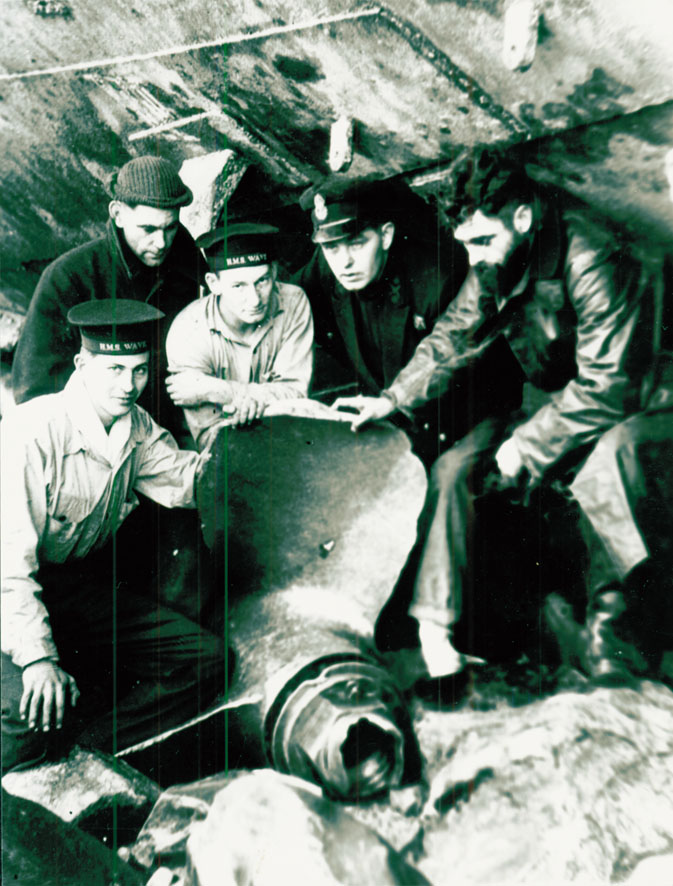 Item: Five sailors around the propeller of minesweeper HMS Wave ashore at St Ives on 30 September 1952