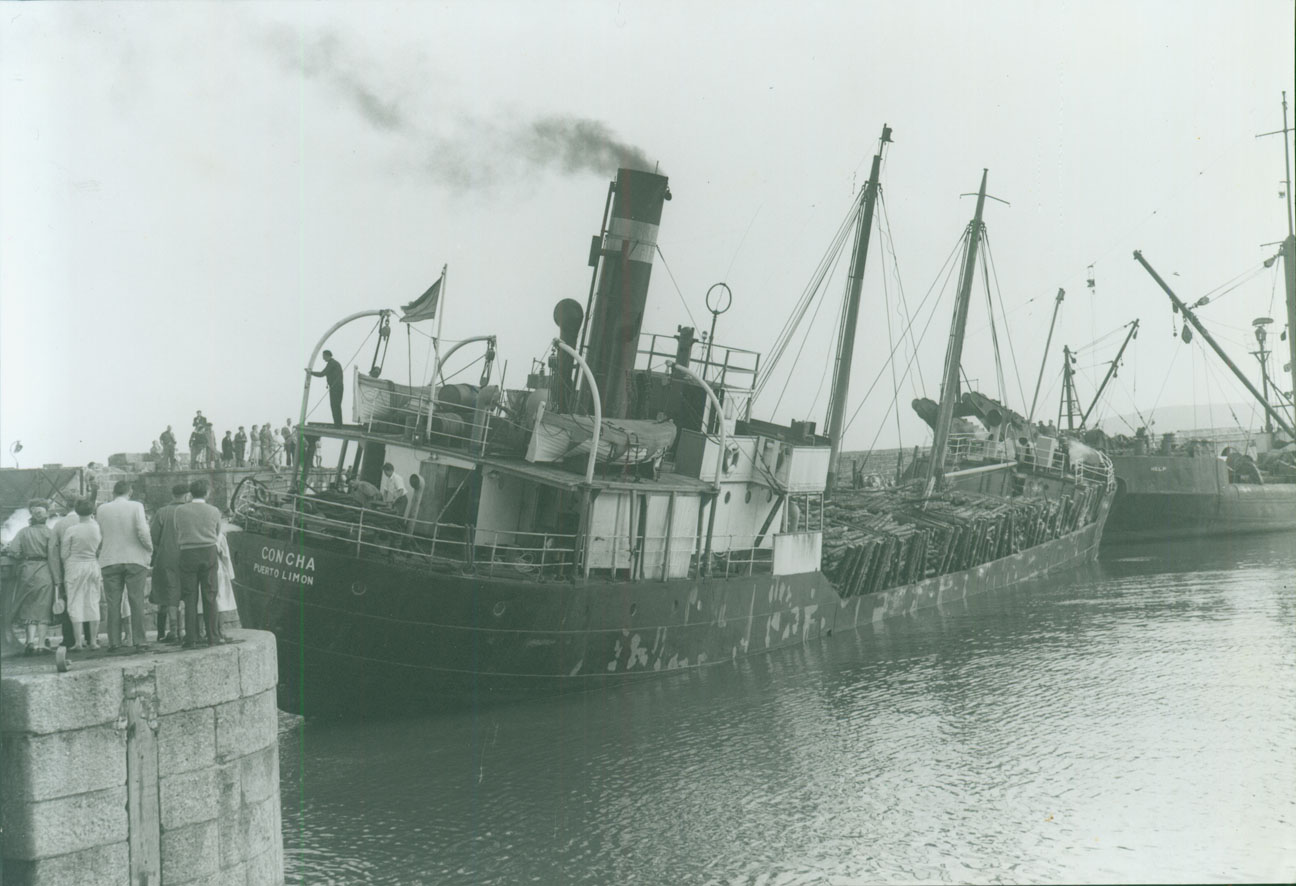 Description: On 15 August 1957 the Costa Rican steamer Concha 660 GRT, bound for Newport with pit props, arrived at Penzance with engine trouble and a 20 degree list which developed when the cargo shifted in a storm 70 miles north of Bordeaux. The Concha sank a year later off St Ann's Head following an explosion in the engine room.