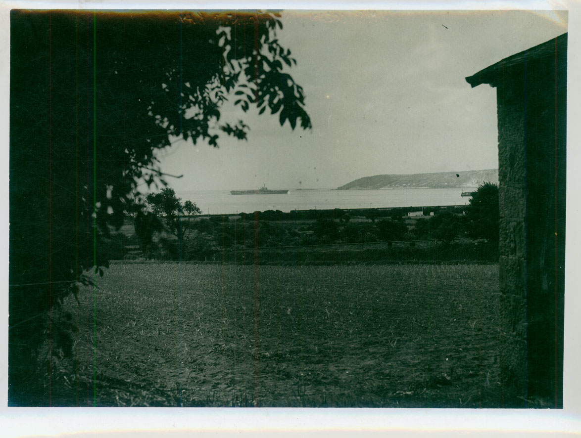 Description: HMS Ocean in Mounts Bay. She was the fifth ship called Ocean to be built for the British Royal Navy. She served in the Korean War and during the Suez crisis. A Colussus aircraft carrier, her keel was laid in 1942; she was built by Alexander Stephen and Sons in Glasgow; she weighed 13,190 tons; she was launched in 1945 and scrapped in 1962. The first landing of a purely jet powered aircraft was made on 4 December 1945 by Eric Winkle Brown flying a Sea Vampire.