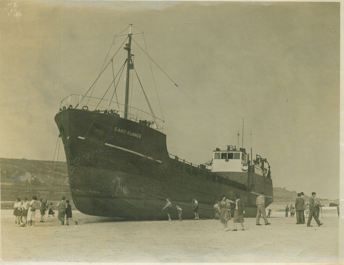 Description: On 31 May 1950, the Goole coaster, 'Sandrunner' carrying coal from Barry Dock to Hayle ran aground in thick fog at Porthmeor Beach, St Ives. The St Ives LSA fired a breeches buoy over the ship, but the crew stayed aboard as it was calm. She was towed off the same evening by the St Ives lifeboat and the long liner Moss Rose.