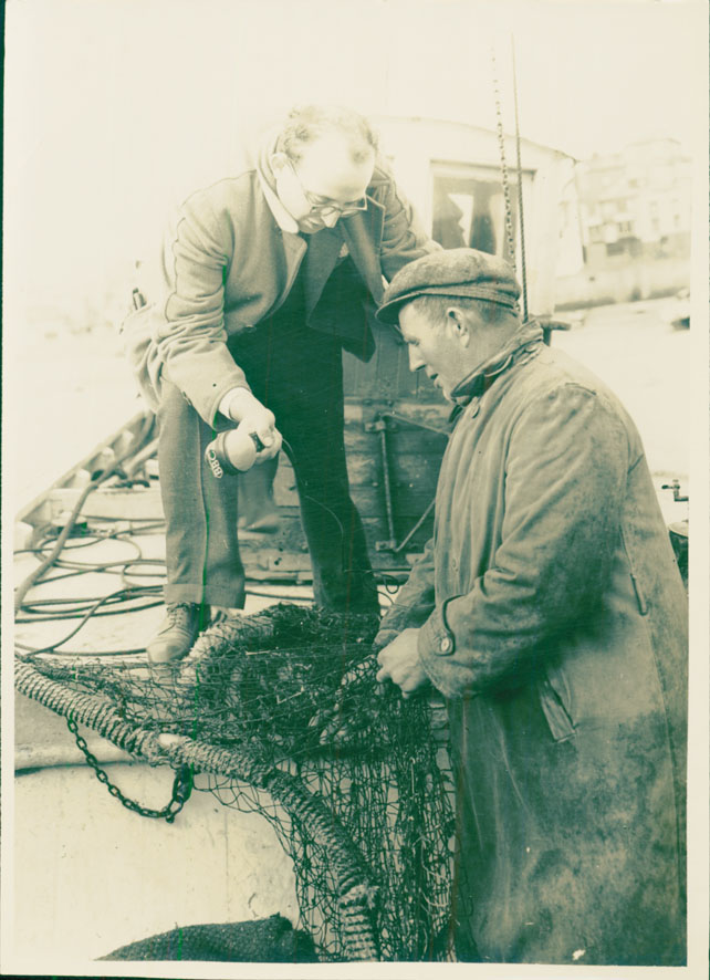 Description: Tommy Toman, skipper of the SS25 Nellie, in mackintosh and flat cap is mending a trawl on a St Ives gig whilst being interviewed by a BBC correspondent.