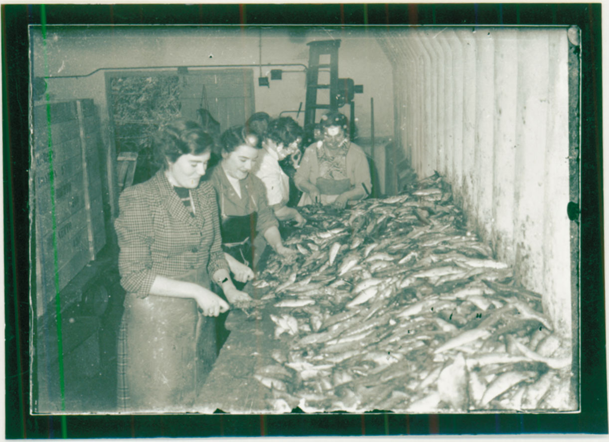 Description: Beth Brownfield and Betty McClary are on the left of the picture, the former perhaps dressed in her best jacket for the photograph; but she may be wearing a pvc apron. The factory was by Newlyn Slip in the area occupied previously by Parodi, fish exporter of Italy and in 2012 by Trelawny Fish. Cornish Canners Ltd was started by Shiphams of Chichester who also made fish paste and had a factory at Long Rock. The company had their own boat, The Chichester Lass was skippered by Joe Brownfield whose portrait was used in their advertising. One crew member was John Foster Tonkin.