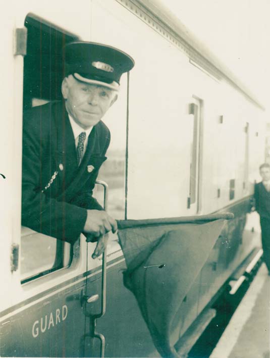 Item: T. C. Maddern waves his last flag before retirement as a railway guard