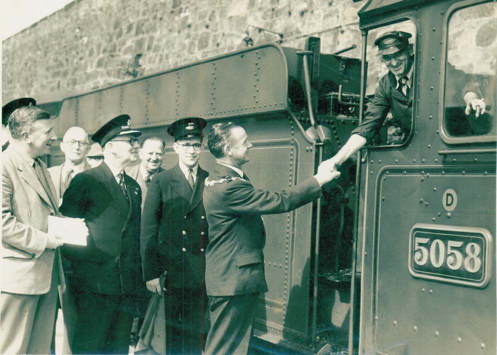 Description: On the 50th anniversary of the Cornish Riviera Express the 5058 leaves Penzance Station with the Mayor congratulating the crew. From left to right: F Caldon, relief station master; ?; Paddington Guard; A Goldsworthy, NUR; Jack Stephens, Mayor; Driver from Laira. The engine was built on 31 May 1937 and withdrawn from service on 31 March 1963. She was disposed of on 30 April 1963.