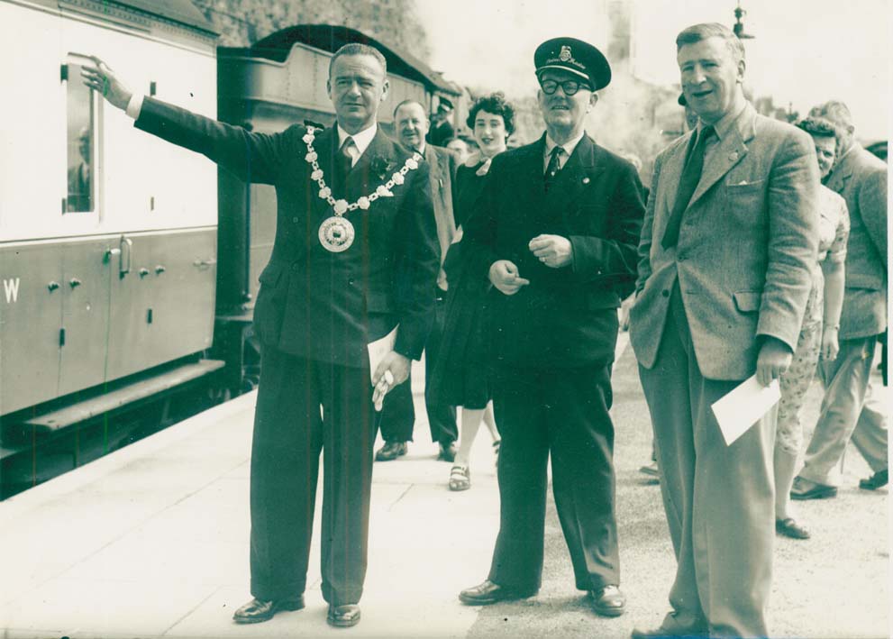 Description: The Mayor, the relief station master and the NUR representative wave the Cornish Riviera Express out of Penzance Station on its 50th anniversay.